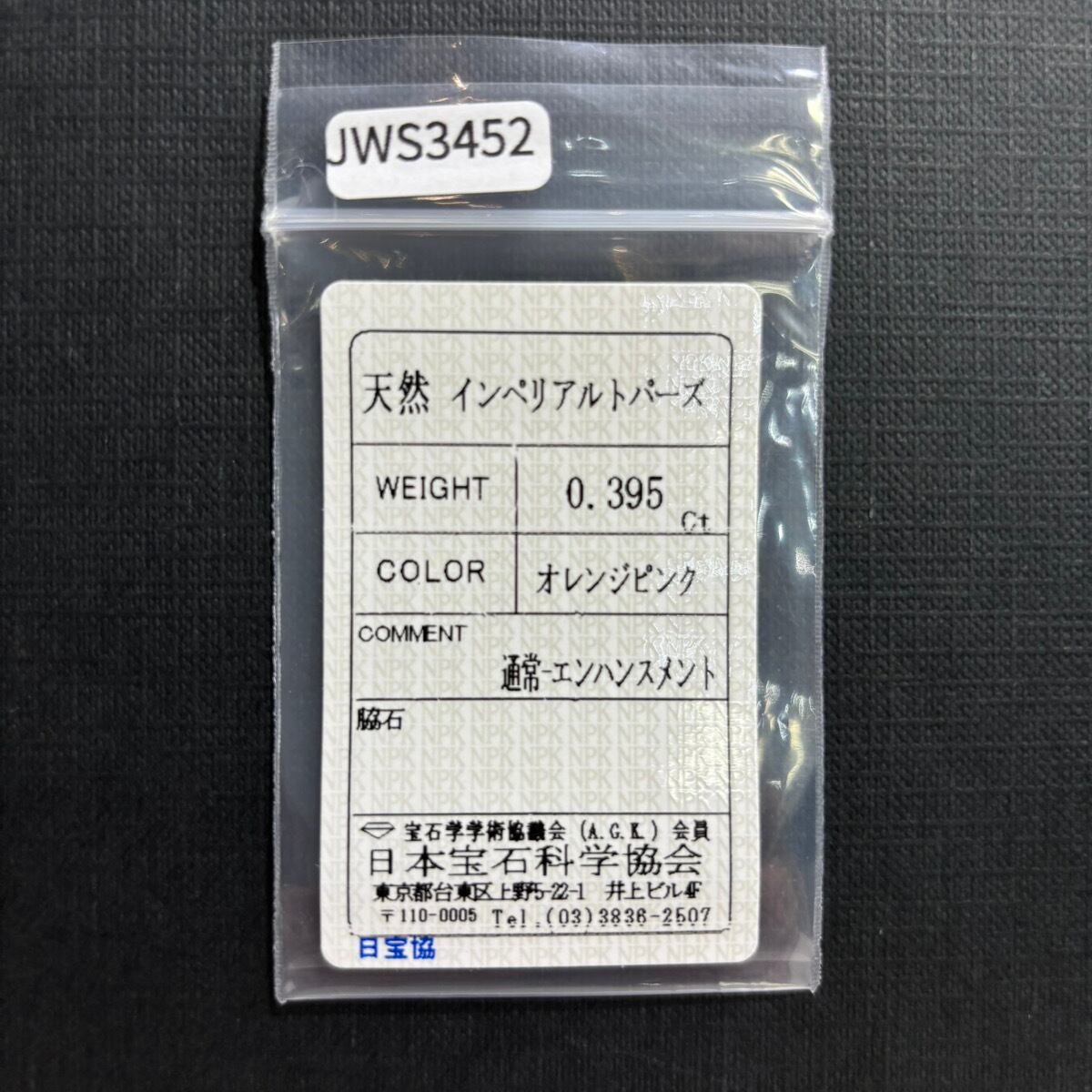 【9/11新着】インペリアルトパーズ 0.395ct【ソーティングメモ付】#JWS3452