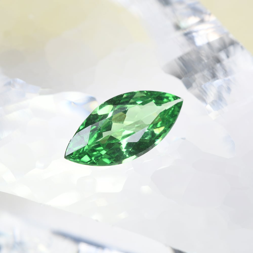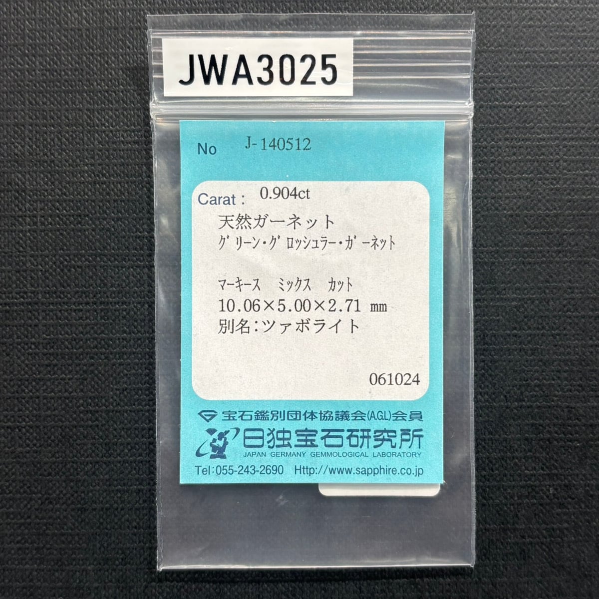 【一点もの保証】本品は一点ものです。写真の品をお届けいたします。お問い合わせの際は商品番号「JWA3025」をお知らせください。【商品データ】宝石名:ツァボライト / 重さ:0.904ct / カット:マーキスミックスカット / サイズ:10.06×5×2.71mm / 色:グリーン / 産地:タンザニア / 鑑別:日独宝石研究所