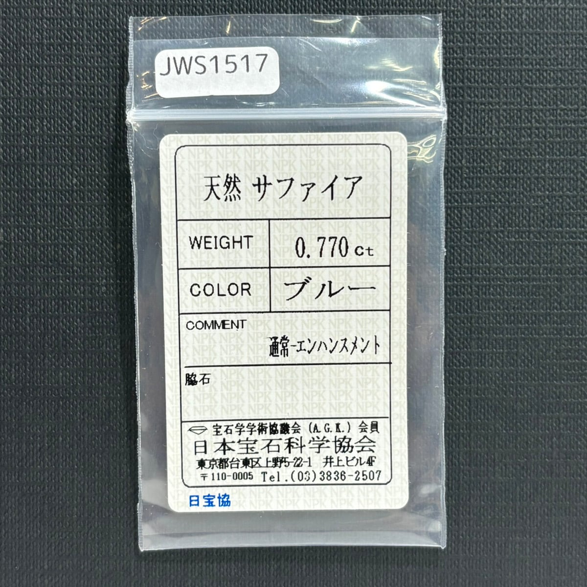 【一点もの保証】本品は一点ものです。写真の品をお届けいたします。お問い合わせの際は商品番号「JWS1517」をお知らせください。【商品データ】宝石名:サファイア / 重さ:0.77ct / カット:オーバル・ミックス・カット / サイズ:6.4x4.8x3.0mm / 色:ブルー / 産地:マダガスカル / 鑑別:日本宝石科学協会 / 備考:加熱