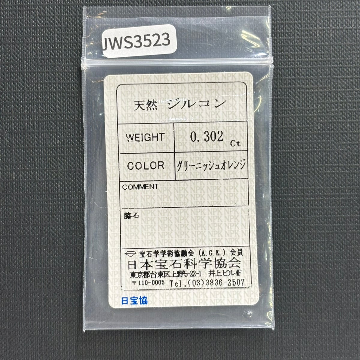 【一点もの保証】本品は一点ものです。写真の品をお届けいたします。お問い合わせの際は商品番号「JWS3523」をお知らせください。【商品データ】宝石名:ジルコン / 重さ:0.302ct / カット:ラウンド・ミックス・カット / サイズ:3.7x2.6mm / 色:グレーニッシュオレンジ / 産地:タンザニア / 鑑別:日本宝石科学協会