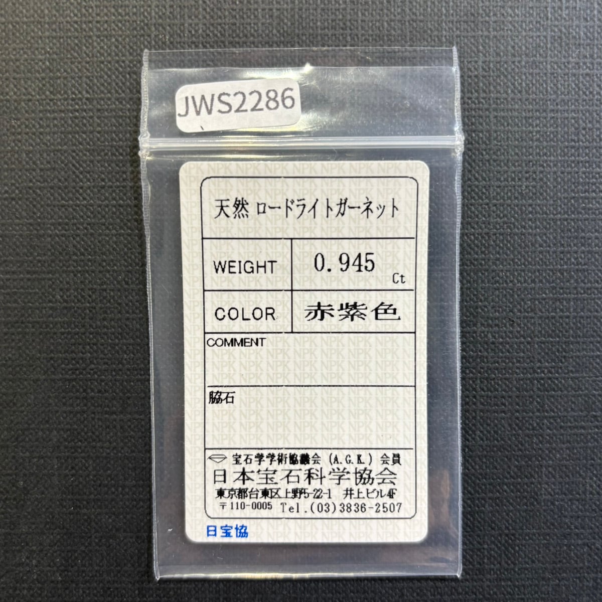【一点もの保証】本品は一点ものです。写真の品をお届けいたします。お問い合わせの際は商品番号「JWS2286」をお知らせください。【商品データ】宝石名:ロードライトガーネット / 重さ:0.945ct / カット:オーバル・ミックス・カット / サイズ:5.7x5.0x3.3mm / 色:赤紫色 / 産地:モザンビーク / 鑑別:日本宝石科学協会 ソーティング付 / 備考:(仕入れ元からの情報)非加熱、未処理 / 注意事項:ルーペでインクルージョンが見られる個体もございます。