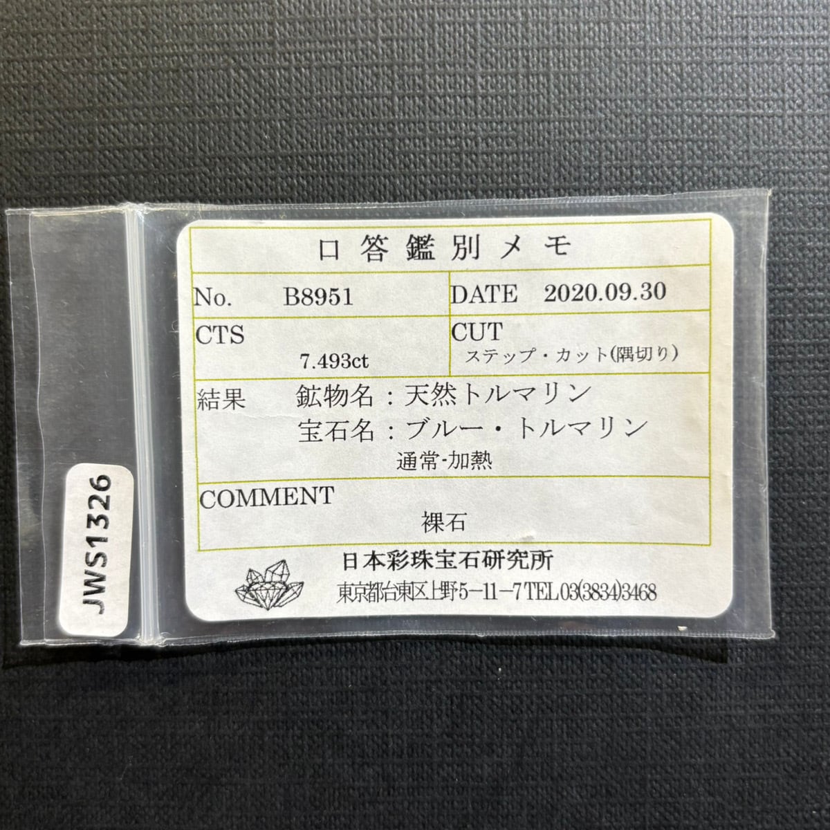 【一点もの保証】本品は一点ものです。写真の品をお届けいたします。お問い合わせの際は商品番号「JWS1326」をお知らせください。【商品データ】宝石名:ブルートルマリン / 重さ:7.493ct / カット:ステップ・カット(隅切り) / サイズ:12.22x9.38x6.66mm / 色:グリーンブルー / 産地:アフガニスタン / 鑑別:日本彩珠宝石研究所 口答鑑別メモ付