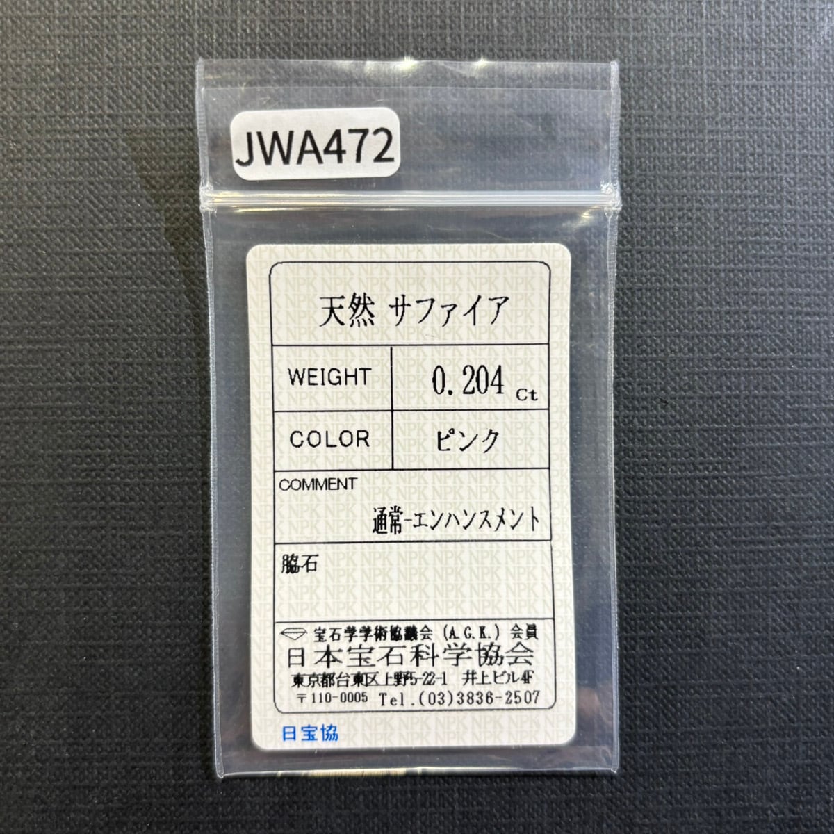 【一点もの保証】本品は一点ものです。写真の品をお届けいたします。お問い合わせの際は商品番号「JWA472」をお知らせください。【商品データ】宝石名:サファイア / 重さ:0.204ct / カット:ペア・シェイプ・カット / サイズ:3.97x3.73x1.64mm / 色:ピンク / 鑑別:日本宝石科学協会 ソーティング付 / 備考:通常-エンハンスメント