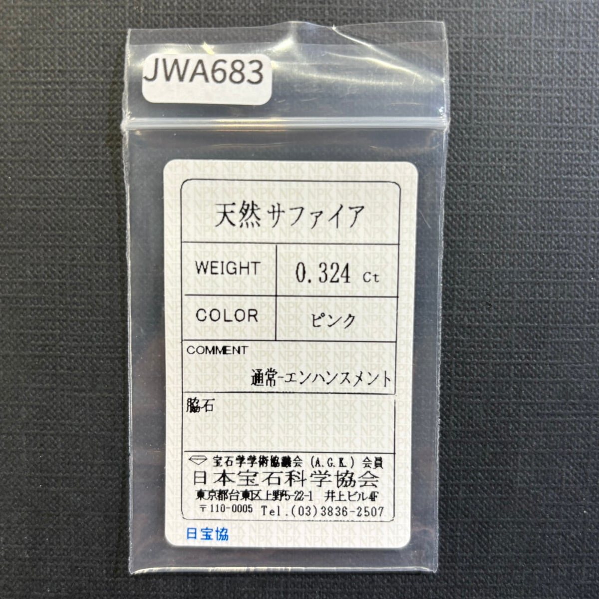 【一点もの保証】本品は一点ものです。写真の品をお届けいたします。お問い合わせの際は商品番号「JWA683」をお知らせください。【商品データ】宝石名:サファイア / 重さ:0.324ct / カット:ペア・シェイプ・カット / サイズ:4.29x4.22x2.22mm / 色:ピンク / 鑑別:日本宝石科学協会 ソーティング付 / 通常-エンハンスメント