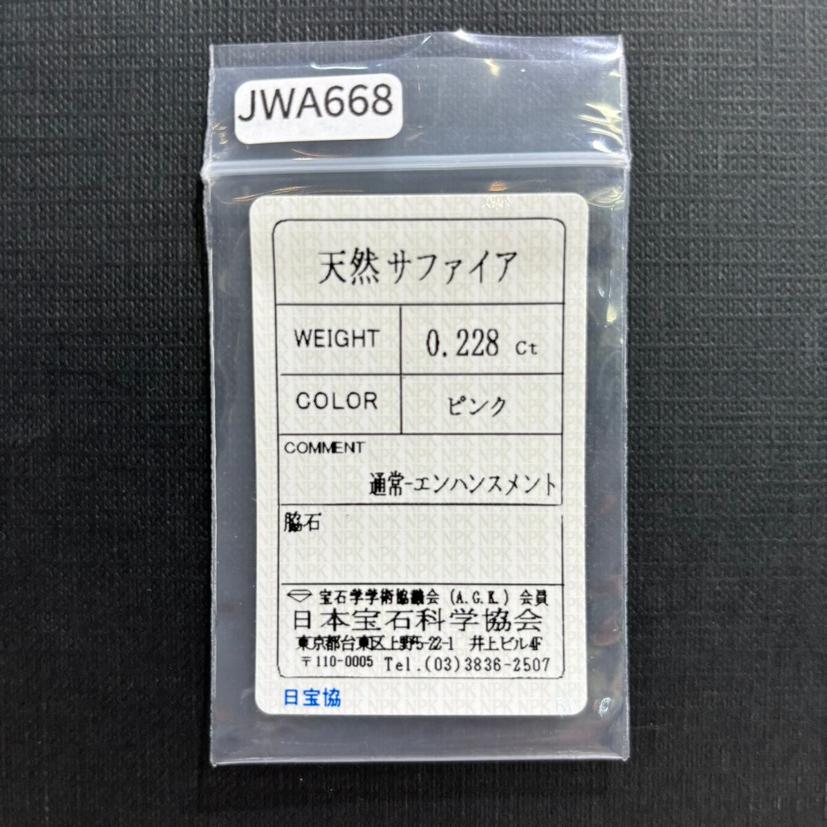 【一点もの保証】本品は一点ものです。写真の品をお届けいたします。お問い合わせの際は商品番号「JWA668」をお知らせください。【商品データ】宝石名:サファイア / 重さ:0.228ct / カット:エメラルド・カット / サイズ:4.09x3.10x1.64mm / 色:ピンク / 鑑別:日本宝石科学協会 ソーティング / 備考:通常-エンハンスメント