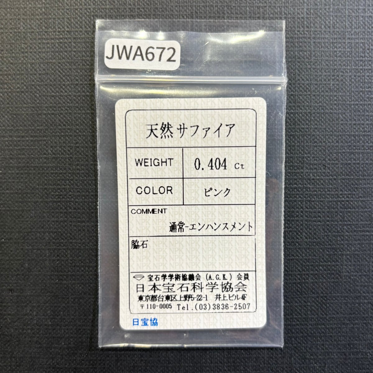 【一点もの保証】本品は一点ものです。写真の品をお届けいたします。お問い合わせの際は商品番号「JWA672」をお知らせください。【商品データ】宝石名:サファイア / 重さ:0.404ct / カット:オーバル・ミックス・カット / サイズ:4.98x3.94x2.39mm / 色:ピンク / 鑑別:日本宝石科学協会 ソーティング付 / 備考:通常-エンハンスメント