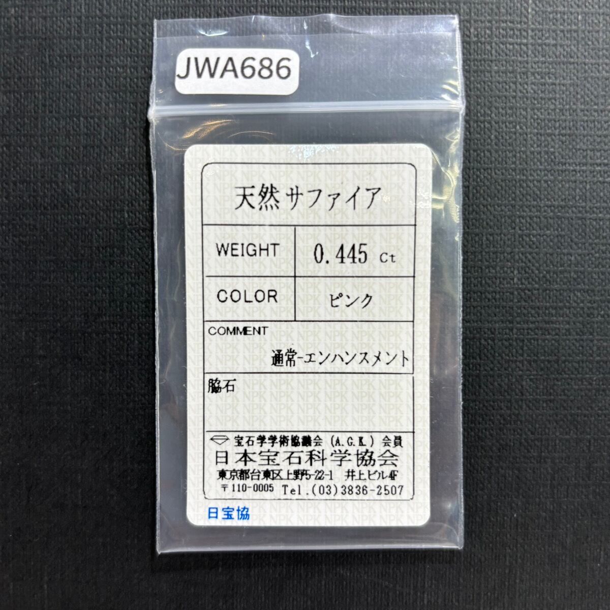 【一点もの保証】本品は一点ものです。写真の品をお届けいたします。お問い合わせの際は商品番号「JWA686」をお知らせください。【商品データ】宝石名:サファイア / 重さ:0.445ct / カット:オーバル・ミックス・カット / サイズ:5.10x4.09x2.27mm / 色:ピンク / 鑑別:日本宝石科学協会 ソーティング / 備考:通常-エンハンスメント