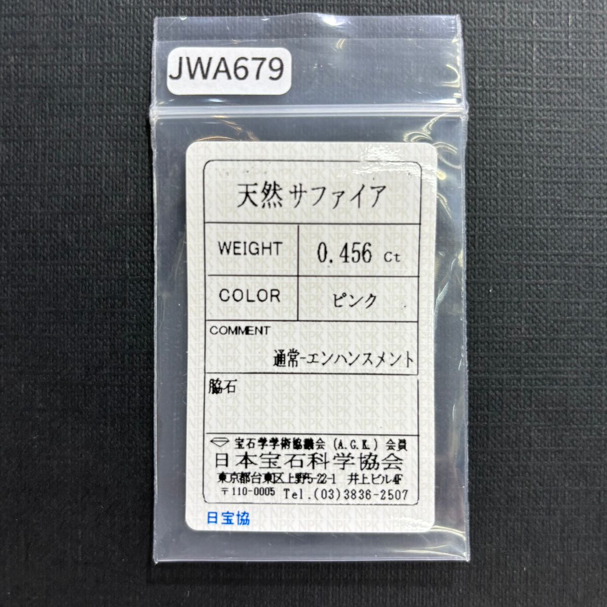 【一点もの保証】本品は一点ものです。写真の品をお届けいたします。お問い合わせの際は商品番号「JWA679」をお知らせください。【商品データ】宝石名:サファイア / 重さ:0.456ct / カット:オーバル・ミックス・カット / サイズ:5.15x4.15x2.37mm / 色:ピンク / 鑑別:日本宝石科学協会 ソーティング / 備考:通常-エンハンスメント