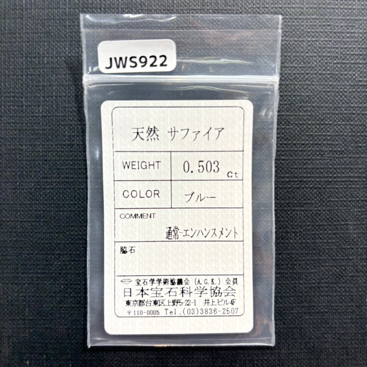 【一点もの保証】本品は一点ものです。写真の品をお届けいたします。お問い合わせの際は商品番号「JWS922」をお知らせください。【商品データ】宝石名:サファイア / 重さ:0.503ct / カット:オーバル・ミックス・カット / サイズ:5.1x4x3.6mm / カラー:ブルー / 鑑別:日本宝石科学協会 ソーティング付 / 備考:通常-エンハンスメント