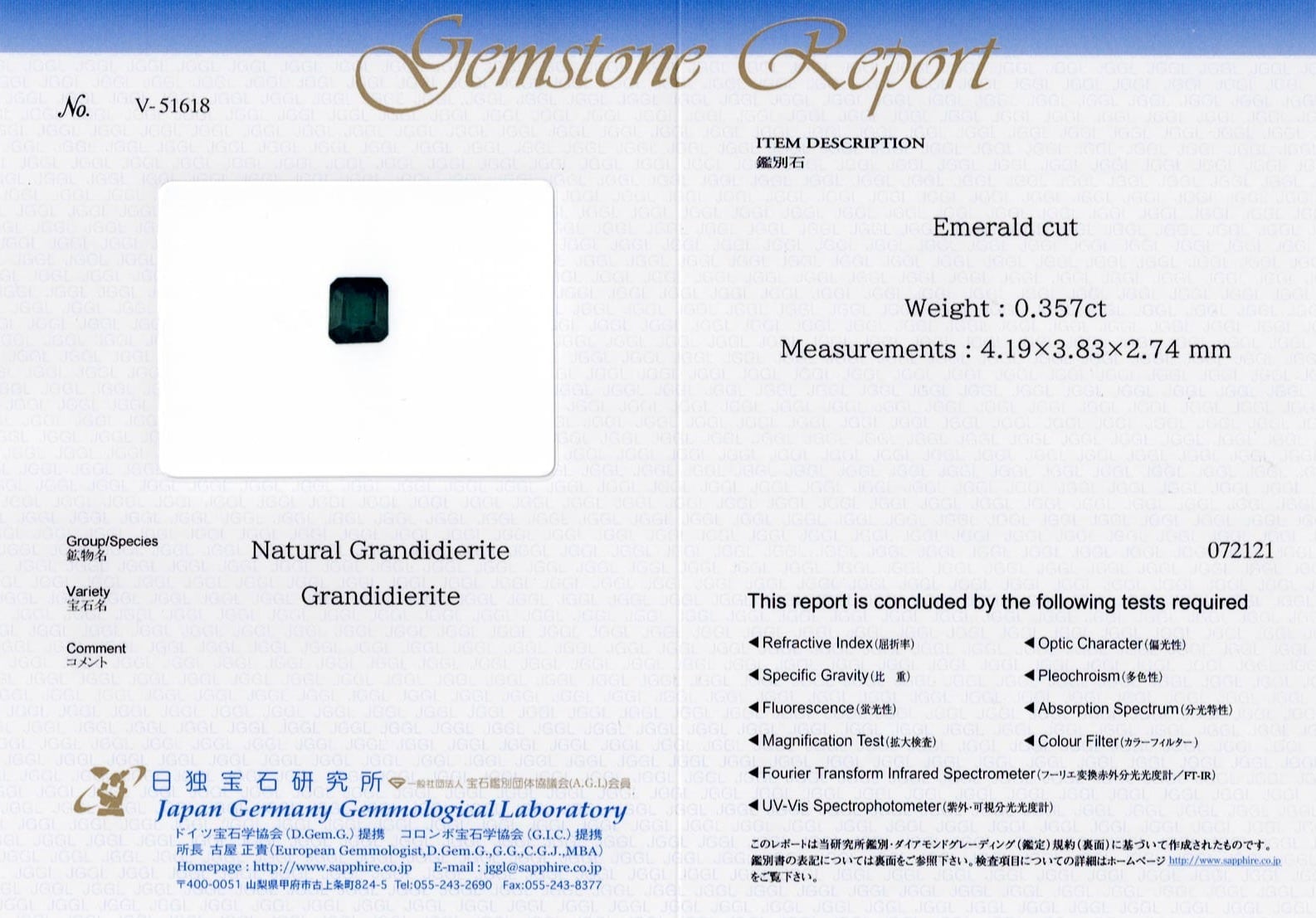【一点もの保証】本品は一点ものです。写真の品をお届けいたします。お問い合わせの際は商品番号「JW074」をお知らせください。【商品データ】宝石名:グランディディエライト / 重さ:0.357ct / カット:エメラルド・カット / サイズ:4.19x3.83x2.74mm / カラー:ブルーイッシュグリーン / 産地:マダガスカル / 鑑別:日独宝石研究所