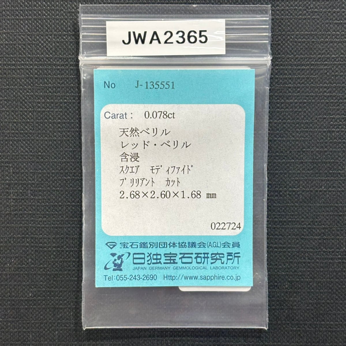 【一点もの保証】本品は一点ものです。写真の品をお届けいたします。お問い合わせの際は商品番号「JWA2365」をお知らせください。【商品データ】宝石名:レッドベリル / 重さ:0.078ct / カット:スクエア モディファイド ブリリアント カット/ サイズ:2.68×2.6×1.68mm / 色:レッド /産地:アメリカ / 鑑別:日独宝石研究所 ソーティングメモ付 / 備考:含浸