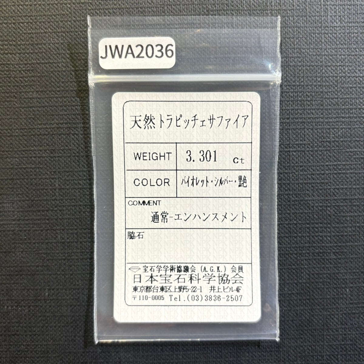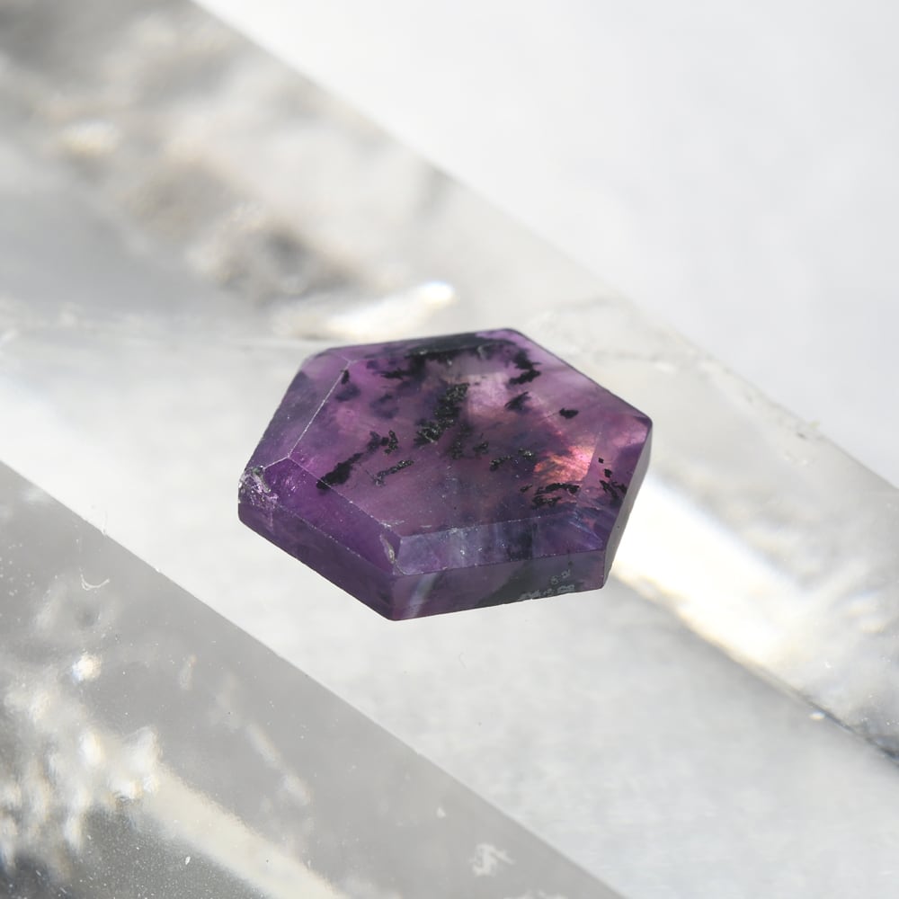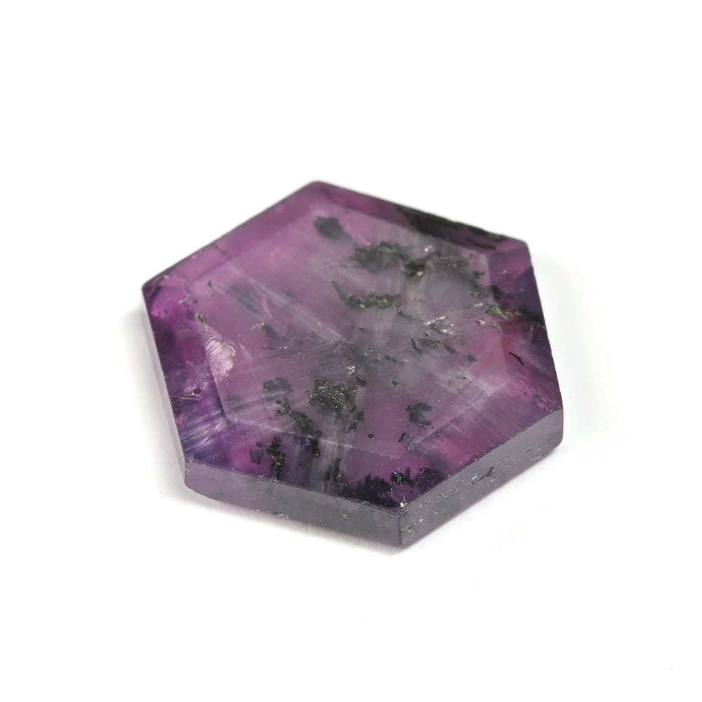 【一点もの保証】本品は一点ものです。写真の品をお届けいたします。お問い合わせの際は商品番号「JWA2036」をお知らせください。【商品データ】宝石名:トラピッチェ・パープル・サファイア / 重さ:3.301ct/ カット:ヘキサゴン / サイズ:10.5×9.3×2.4mm / 色:バイオレット・シルバー・黒色 / 産地:パキスタン(カシミール地方)/ 鑑別:日本宝石科学協会ソーティングメモ付 / 備考:通常ーエンハンスメント