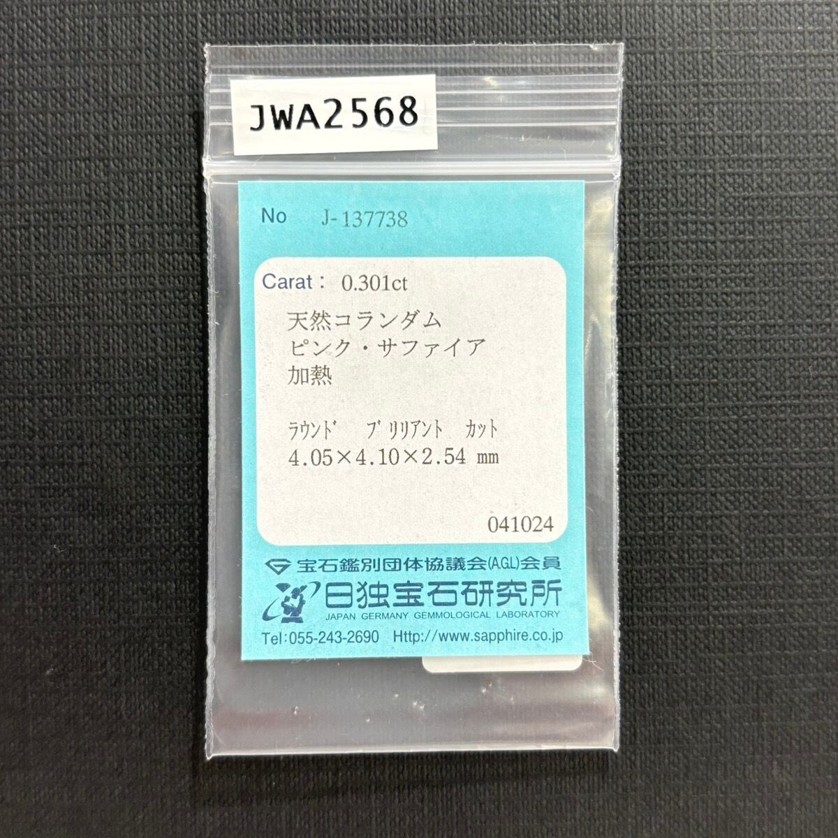 【一点もの保証】本品は一点ものです。写真の品をお届けいたします。お問い合わせの際は商品番号「JWA2568」をお知らせください。【商品データ】宝石名:サファイア / 重さ:0.301ct / カット:ラウンド・カット / サイズ:4.05×4.1×2.54mm / 色:ピンク / 鑑別:日独宝石研究所 / 備考:加熱